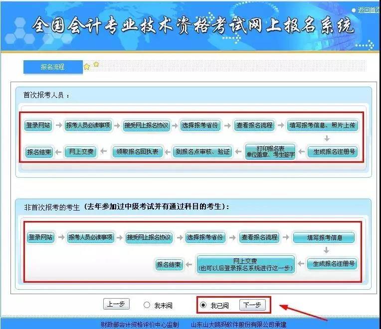 第6步:浏览特别提示,确定“我已阅”。进入报名流程图,仔细查看后,确定“我已阅”,点击下一步。